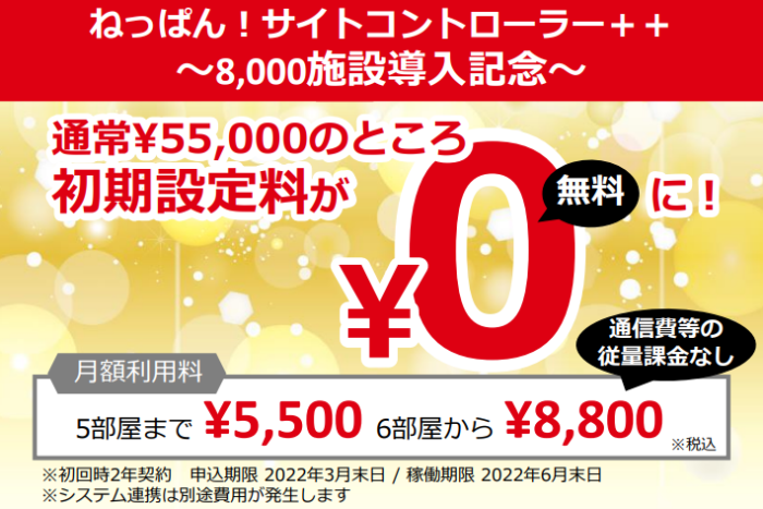 弊社では、「ねっぱん!サイトコントローラー++」ご契約施設様が8,000施設を突破したことを記念いたしまして、「ねっぱん!サイトコントローラー++」の新規導入キャンペーンを本日より実施いたします。3月末日までのお申込みで、「ねっぱん!サイトコントローラー++」の初期設定料金55,000円(税込)を無料にてご提供させていただきます。この機会に「ねっぱん!サイトコントローラー++」の導入をご検討いただければ幸いです。