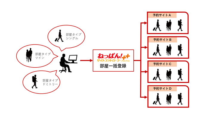 これまで宿泊施設は、新しい部屋タイプを複数の予約サイトで販売する場合、各予約サイトの管理画面にログインして部屋タイプを個別に登録する必要があるため作業に手間がかかっておりました。部屋一括登録機能により、「ねっぱん!サイトコントローラー++」の画面で新しい部屋タイプを作成すると、複数の予約サイトに一括で部屋タイプが登録できるようになりますので業務の効率化を図ることができます。[*1]
